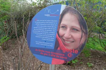 Mais c’est surtout dans le jardin, sur l’allée extérieure qui sert de file d’attente que l’on découvre un " jardin du recyclage ", le sol étant réalisé à partir des déchets végétaux du parc. Le visiteur découvre, amusé, des objets qui l’on propose une seconde vie. C’est réellement créatif et permet donc de mieux appuyer la problématique. Entre les objets, le visiteur découvre 10 panneaux reprenant chacun un des dix gestes conseillés par la charte de la Fondation Maud Fontenoy. A savoir, ceux qui le souhaitent peuvent signer la charte sur un document prévu à cet effet et la poster dans une des boîtes aux lettres disponibles.