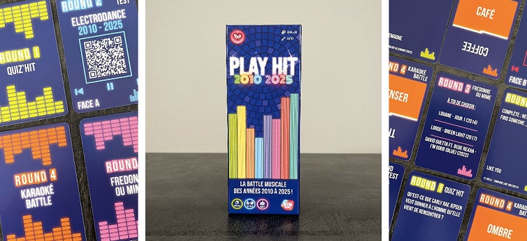Après le carton « Hister » chez Dujardin, voici un nouveau venu dans l’air des jeux d’ambiances, à la fois « Revival » et « Quizz musicaux ». Ici, les joueurs s’affrontent en équipe en 4 Manches décrites ci-dessus. Toujours créé par la même équipe derrière le pseudo « Ben & JB », qui avait déjà été derrière des jeux comme « Juduku » et « Trou noir », « Play Hit » est avant tout destiné aux amis qui vont pouvoir s’affronter autour de challenges musicaux, chaque équipe à tour de rôle. Une recette redoutable d’efficacité, qui cherche avant tout à amuser les participants, mais qui offre surtout la possibilité de créer un lien entre les personnes formant les équipes. Il pourrait même être utilisé dans des séminaires d’entreprise cherchant à renforcer la cohésion de groupe, tant ici, chacun peut apporter sa connaissance et chercher à faire gagner son équipe.