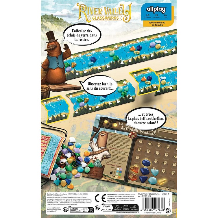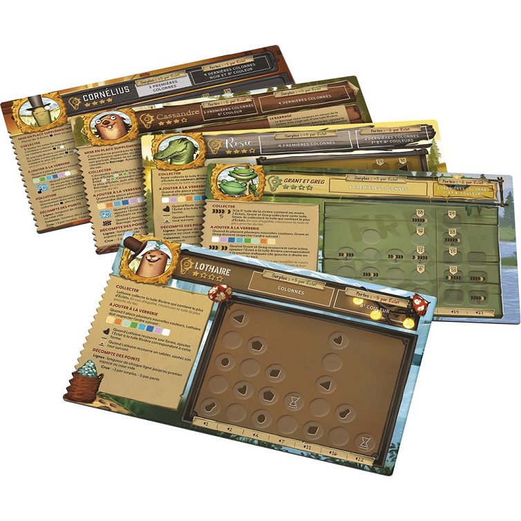 Bienvenue à River Valley ! Les magnifiques pièces de verre que l'on trouve le long de la rivière ont attiré les créatures des bois les plus entreprenantes pour qu'elles s'y installent. Participez à la compétition en collectant des morceaux de verre et en les plaçant stratégiquement dans votre magasin. Dans « River Valley Glassworks », vous incarnez l'un de ces pionniers, qui fabrique du verre sur le marché des tuiles de la rivière. Pour ce faire, vous devez jouer une pièce de votre inventaire dans la rivière. Chaque tuile de rivière ne peut prendre qu'une forme spécifique, et vous devez la jouer dans un espace adjacent à l'endroit d'où vous voulez tirer le verre. Une fois que vous avez ramassé votre verre, la rivière se déplace vers l'avant, révélant de nouvelles pièces et de nouvelles opportunités. Stockez le verre que vous ramassez de manière stratégique dans votre magasin. Selon la façon dont les pièces de verre sont placées, votre score changera radicalement. Remplissez les lignes et les colonnes pour gagner des points bonus, mais ne tirez pas trop de pièces d'un même type pour éviter les points négatifs !