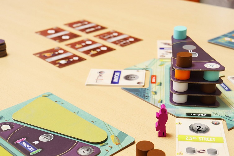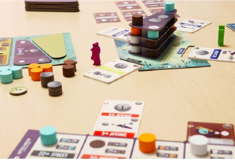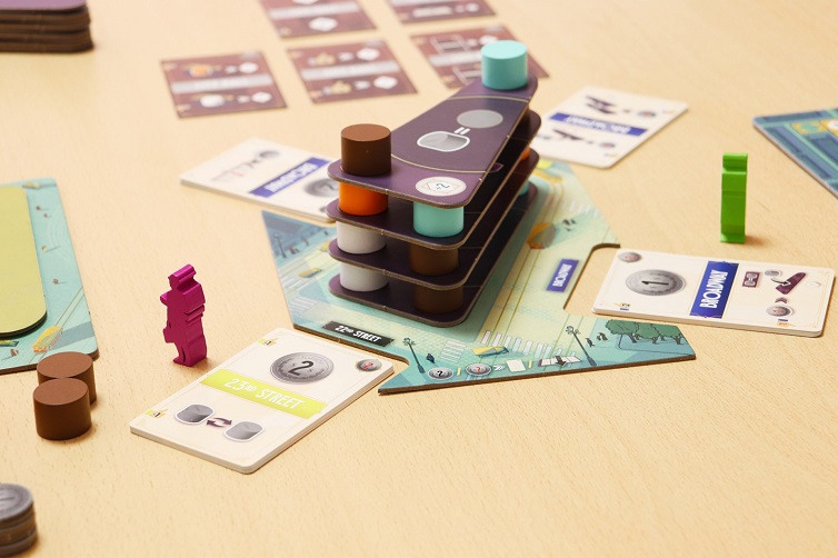 Toujours dans l’esprit des jeux « Duel » que l’on va pouvoir classer dans la catégorie « Initiés », car « Flatiron » c’est jeu qui nécessite une certaine mise en place, mais également une prise en main un peu plus complexe, que son illustration le laisse supposer. Car, avant tout, dans ce jeu de construction à deux, il y a un certain nombre de paramètres à prendre en compte pour pouvoir scorer. Car « Flatiron », se joue en plusieurs étapes que les joueurs doivent accomplir à leur tour. Pour commencer ils devront exécuter deux actions : Déplacer son architecte et effectuer une action sur le lieu où se trouve ce dernier : Acheter une carte, Activer les actions de ce lieu ou Gagner 2 Dollars. Et c’est déjà là que commence le côté excitant de ce Duel. Car tout est question de choix et certainement également d’anticipation sur ce que peut et ce que veut faire l’adversaire. « Garder constamment un œil sur l’autre joueur » n’a jamais eu autant de sens que dans ce jeu, où l’on score en faisant avancer la construction comme dans un jeu coopératif. Sauf qu’ici chaque action fait scorer celui qui l’a fait et peut pénaliser celui qui ne l’a pas anticipé.