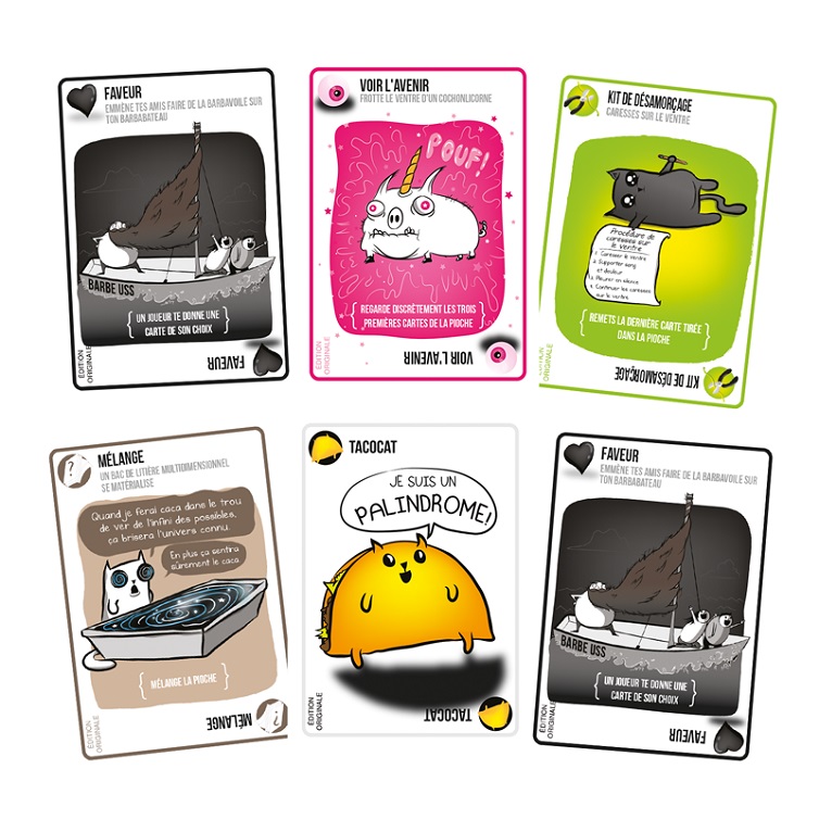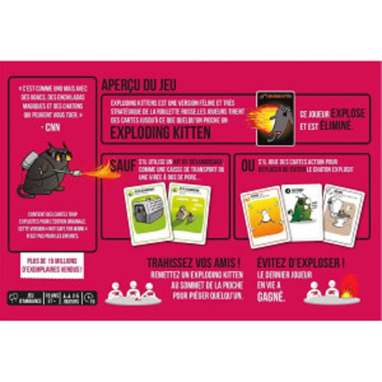Bon, il n’y a pas grand-chose à dire concernant cette nouvelle version d’ « Exploding Kittens », un jeu simple et drôle dans lequel vous allez devoir poser des cartes, en effectuer les actions puis piocher une carte en espérant ne pas avoir une carte qui vous fasse exploser. Mais rassurez-vous certaines empêchent l’explosion et vous permettent même d’aller embêter les copains. Comme le disent Elan Lee (Happy Salmon), Matthew Inman (Thérapie Foireuse) et Shane Small (Streaking Kittens), tous les joueurs vont finir par exploser, il faut simplement être le dernier : Le survivant.