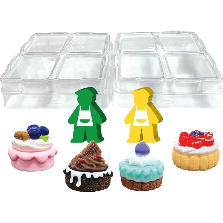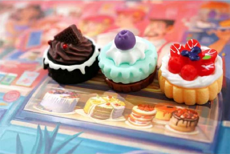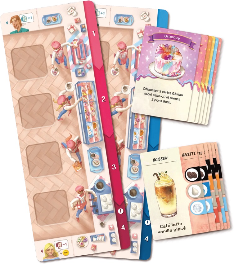 Comme nous le voyons, ce jeu est, avant tout, une question de choix et de tactiques de jeu, que chaque joueur devra mettre en place avant de commencer sa partie et à chaque manche. « Coffee Rush » est un jeu familial à partir de 8 ans et offre beaucoup de possibilité de jeu. Et l’extension va dans ce sens en ajoutant des cartes Gâteaux que l’on découvre au moment de prendre des cartes commandes. On prend alors un gâteau dans la réserve et le pose sur la carte commande. Il y restera tout le temps du parcours de cette dernière. Si la commande est envoyée, le joueur prend alors, une carte gâteau dans la pioche prévue à cet effet, elle lui permettra de moins perdre en commande envoyée lors de déblocage d’améliorations. Comme toujours, ce sont les commandes envoyées qui font piocher des cartes aux autres joueurs et vient ainsi renforcer leur difficulté.
