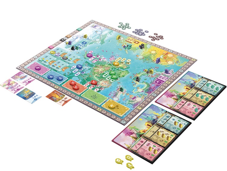 Voilà un jeu comme je les aime ! Vous savez, ces jeux qui paraissent compliqués lorsque l’on ouvre la boite, mais qui se révèlent non seulement plus faciles que prévu mais surtout d’une grande jouabilité qui impose de constamment réviser sa tactique de jeu, par plusieurs pistes de « scoring » possible. Et bien « Navoria » s’inscrit complètement dans ce type de jeu. Un jeu de plateau convivial où tout est inscrit sans pour autant surcharger le visuel qui représente une contrée lointaine, le Pays magique de « Navoria ». Chacun possède son propre tableau de bord, qui va permettre de stocker des ressources et également de scorer. Ce qui est un très bon point c’est tout est indiqué que ce soit sur le plateau centrale ou sur celui des joueurs. C’est également sur le tableau des joueurs que l’on va stocker les refuges que l’on pourra construire tout au long de la partie.