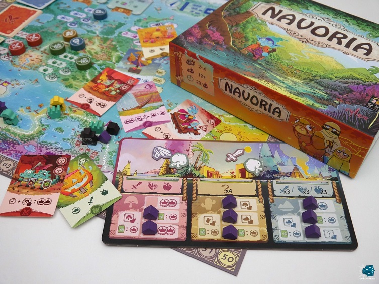 Dans « Navoria », explorez les continents nouveaux et étranges qui ont émergé de la mer et amassez des richesses pour remporter la partie. Le conseil de « Navoria » a décidé de les explorer. Vous faites partie de la poignée d'aventuriers qui a répondu à l'appel... le décor est planté pour l'aventure de votre vie ! Une partie de « Navoria » se déroule en trois manches. À chacune d’elles, vous recrutez des habitants (cartes) et gagnez des récompenses. À la fin de la troisième, le joueur avec la plus grosse fortune gagne la partie. À votre tour, piochez deux jetons dans le sac. Choisissez-en un et recrutez un habitant dans la pioche correspondante. L’autre jeton est placé au centre-ville. Plutôt que de piocher, vous pouvez justement choisir un jeton déjà au centre-ville ! Recrutez des soldats, des aventuriers, des marchands, des artisans ou des bâtisseurs. Obtenez des faveurs en recrutant des membres d’une même espèce. Construisez des refuges. Explorez le continent et trouvez des trésors. Collectez des ressources pour compléter des commandes. Amassez des richesses grâce à votre stratégie pour remporter la partie.