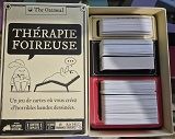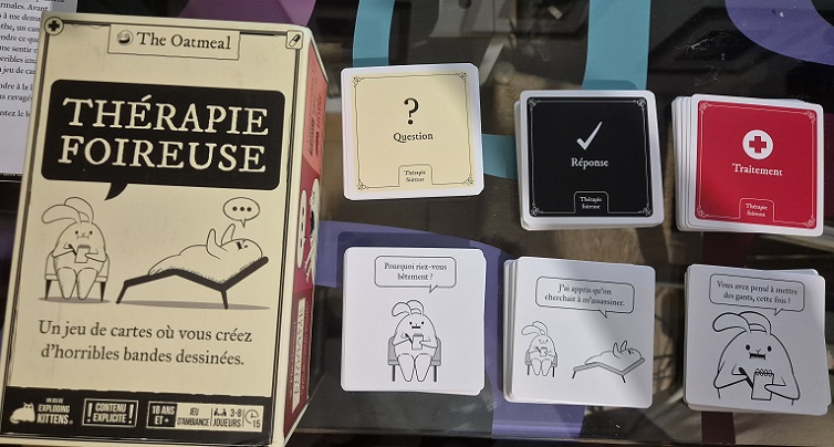 « Thérapie Foireuse » est un jeu d'ambiance pour adultes où vous devrez créer d'horribles bandes dessinées. Ce jeu d’ambiance déjanté vous propose d’assister à des séances de thérapie... pas comme les autres. L'association de la carte Question, d'une Réponse (choisies par le joueur « psy ») avec la carte Traitement que vous allez proposer, va créer une mini bande dessinée absurde, au scénario le plus trash et drôle possible. L’objectif ? Faire rire (ou déstabiliser) le psy pour qu'il choisisse votre chute plutôt que celle des autres joueurs. Le joueur incarnant le psy pioche une question, trois réponses et choisit l'association qu'il préfère. Les autres participants complètent la BD avec leur meilleure carte Traitement. Le Psy lit les propositions et choisit la plus drôle. Le premier joueur à 3 points gagne ! Conçu par « The Oatmeal » (le célèbre auteur de BD) et les créateurs d’Exploding Kittens, « Thérapie Foireuse » est un jeu à l’humour noir délibérément trash, réservé aux adultes. Avec plus de 400 cartes, chaque partie est unique. Âmes sensibles s'abstenir ! Les autres s'amuseront...comme des petits fous !