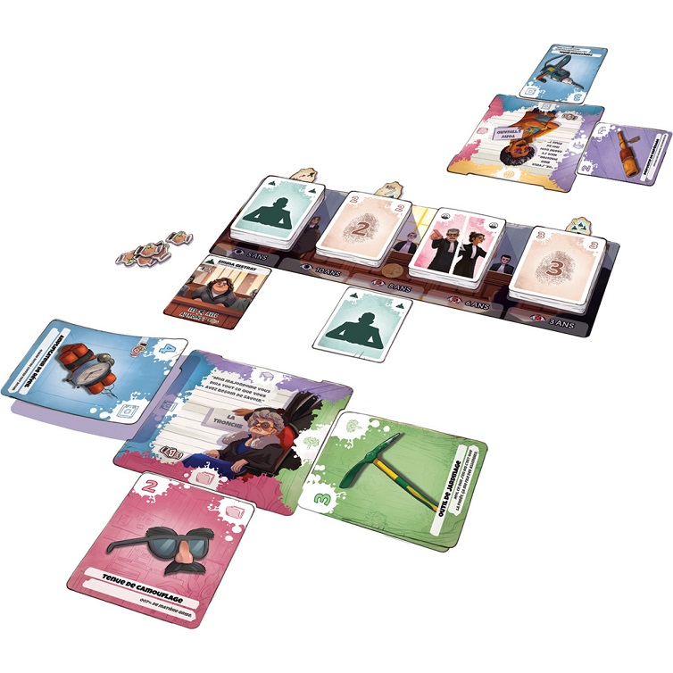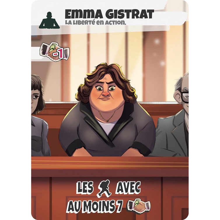 Créé par Christophe Lauras (Le Clans des Souris) et Franz Couderc (Transorient Express) et illustré par Yvan Tesi (Sea Zones) est un jeu de cartes où l’on devoir balancer les copains pour avoir le moins d’années de prisons à la fin du jeu. Pour cela, chaque joueur à une tuile de jeu qui selon la face choisie contient une capacité ou non. Puis 4 cartes qui forment sa main. Les cartes sont de plusieurs possibilités : « Preuves » avec le nombre d’années de prison au dos, « Objections » qui seront soit une plaidoirie soit une véritable objection qui permettront de contrer l’attaque d’un joueur, des illustrations d’avocats au recto et enfin les « Jurés » dont les capacités se compteront en années de prison à la fin de partie.