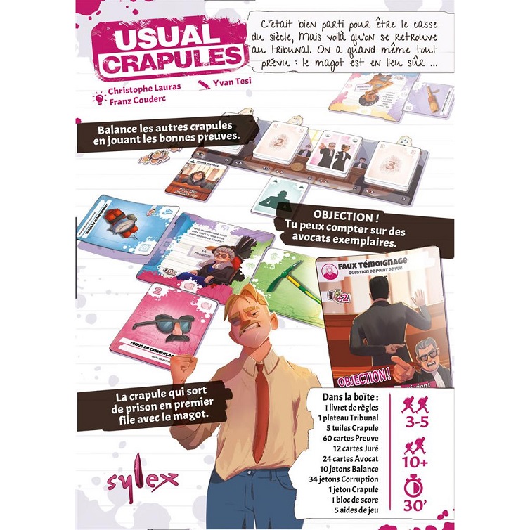 « Usual Crapules » est un jeu d’ambiance accessible dès 10 ans, à savourer entre amis ou en famille pour des scénarios dignes des meilleurs films de braquage ! « Usual Crapules » vous embarque dans une ambiance de procès survolté entre anciens braqueurs. Après un casse raté, les joueurs se retrouvent devant le juge : celui qui écopera de la peine la plus courte pourra aller déterrer le magot avant les autres.Le jeu mêle bluff, combos de cartes et interactions délicieusement perfides. À chaque tour, vous jouez une carte : preuve pour charger un autre joueur, juré pour alourdir les peines, avocat pour plaider l’innocence… ou objection pour retourner la situation. Les mécaniques permettent des ripostes, des chaînes d’actions et de nombreux retournements de situation. Le verdict final dépend du total d’années de prison accumulées par les preuves encaissées et les jurés posés. Chaque partie est rythmée, tendue et drôle, avec une forte rejouabilité grâce aux talents asymétriques des crapules et aux nombreux jetons Balance offrant des effets uniques.