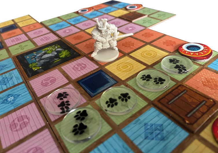 Après quelques hésitations en lisant la règle, nous nous jetons. A chaque Tour, chacun des joueurs choisira une carte action, et le samouraï, une Tuile de Plancher en plus, et les posera faces cachées sur le plateau « Tour de Joueur ». Le choix de la tuile de plancher est important, car si les ninjas marchent dessus, ils sont immédiatement stoppés dans leur progression et donc aperçu par le Samouraï qui, en fonction de là où il se trouve, peut potentiellement attraper le Ninja découvert. En premier c’est le Ninja qui révèle en premier sa carte Action qui correspond d’abord à une action qu’il doit faire, puis à un déplacement. Pour cela, il va poser des tuiles empreintes de pas sur le chemin qu’il parcourt. Une fois cela fait le Samouraï dévoile sa carte et fait son déplacement et par la suite son action.