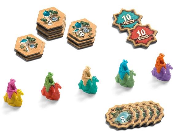 Depuis les droits d’exploitation de « La Traversée du désert » sont passés chez un autre éditeur indépendant : « Allplay » et en profite pour se faire un petit lifting et nous revient dans un nouveau packaging, avec toujours autant de chameau à placer sur les plateau central (30 pour une partie à 5 joueurs et 22, pour 2 joueurs) et des oasis qui changent d’apparence. Après les règles restent les mêmes, et tant mieux ! Ici, donc vous devez former des caravanes avec vos chameaux, en respectant certaines règles bien strictes : Une caravane part toujours d’un leader (Préalablement placés lors de la mise en place), à son tour chaque joueur devra placer 2 chameaux, ils doivent être adjacent à un autre de vos chameaux, mais une caravane ne peut être adjacente à une de même couleur d’un de vos adversaires, par contre, elle peut être adjacente à l’un des vôtres, ou d’un adversaire, d’une couleur différente. Vous pouvez également récupérer des points en vous positionnant sur des points d’eau, ou en étant adjacent à un Oasis. Vous pouvez encercler des zones, ce qui vous permettra de gagner des points en fonction des cases vides à l’intérieur de cette zone, mais cela ne peut se faire qu’avec une seule caravane.