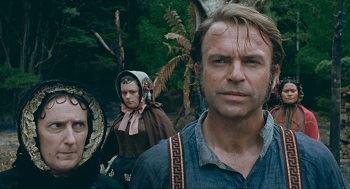 Sam Neill (Jurassic Park), en homme qui veut absolument trouver le respect et l’amour dans les yeux de celle qui a été désignée pour être sa femme.