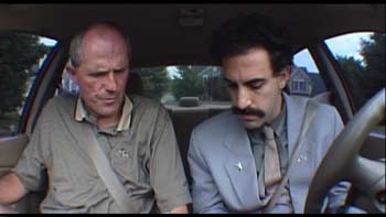 Sacha Baron Cohen (Ali G) ne se refuse rien, aucune transgression ne lui échappe, rien ne semble réellement l’effrayer, et le public en redemande. Car il faut bien le dire, « Borat » est un film qui repousse les limites du transgressif. Toujours sur la corde raide, le film plonge littéralement le spectateur au cœur d’un périple burlesque dont les préjugés sont les principales victimes. On assiste ainsi, médusé, au dialogue entre Borat et l’organisateur d’un rodéo au Texas suivit de l’intervention du journaliste Kazakh dans l’arène de la compétition, ou alors encore le diner chez une famille américaine aisée, en présence du pasteur de la paroisse, qui revient sur les convenances en société, mais qui tourne au drame puritain propre.