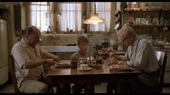Il aura donc fallu attendre 4 ans pour voir enfin Haley Joel Osment, prendre du plaisir à jouer. Souvent (Trop ?) cantonné dans des rôles de petit garçon attendrissant au regard envahi d’une tristesse infini (Sixième sens (99), Un monde meilleur (00), A.I. (01)), le jeune homme ( puisqu’il va avoir 17 ans) s’offre un rôle, qui enfin le met en valeur. Successivement, renfermé, drôle, attendrissant et même parfois ironique, on le sent heureux d’être là. Il force même le trait en faisant de l’autodérision dans une scène où sa mère, Kyra Sedgwick (Né un 4 Juillet (89), Phénomène (96)) mémorable, lui demande d’essayer de sourire. Le gamin a mûri, son jeu aussi, il parvient à le maîtriser, à le nuancer et cela n’en devient que plus profitable pour le film. Les deux vétérans que sont Robert Duvall (Bullitt (68), Le parrain (72), Apocalypse Now (79)) et Michael Caine (L’homme qui voulut être roi (75), Pulsions (80)), n’y sont certainement pas étranger. En effet ,les deux comédiens prennent un réel plaisir à jouer ensemble ce couple de frère coupé d’un monde qu’ils n’ont plus envie de connaître.