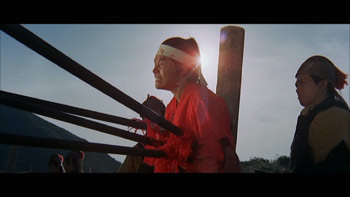 David Chiang meurt debout (comme d’autres personnages dans des films de Chang Cheh), de manière presque burlesque bien que barbare ; il est transpercé de plusieurs flèches, dos à la grande étendue d’eau sur laquelle s’éloigne le radeau emportant le prince sauvé et Ti Lung, en retrait comme souvent par rapport à un